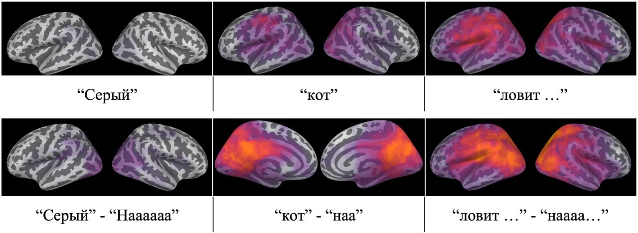 Анализ данных подтвердил, что при выполнении задания активируются классические речевые зоны левого полушария — височные и лобные области, включая участки, отвечающие за понимание и формулировку речи. Активность этих областей нарастала по мере того, как участники продвигались по предложению: сначала включались зоны, связанные с чтением и смыслом, а затем участки, управляющие речевым планированием и артикуляцией.